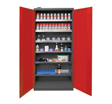 Construcción robusta de acero soldado. Con 4 bandejas regulables, con capacidad de 50 kg. Cerradura de 2 puntos. Color martelé gris y rojo. Abertura de las puertas hasta 180°.