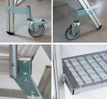 El sistema frenante automático. La escalera con ruedas de 125 mm de diámetro.