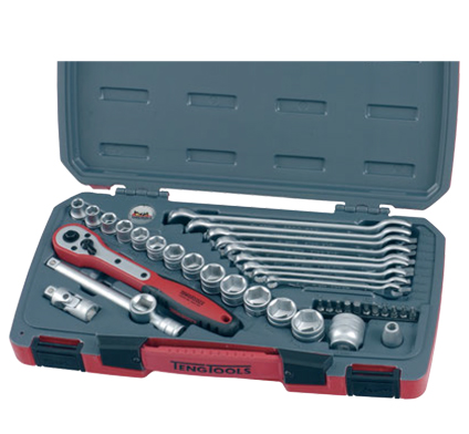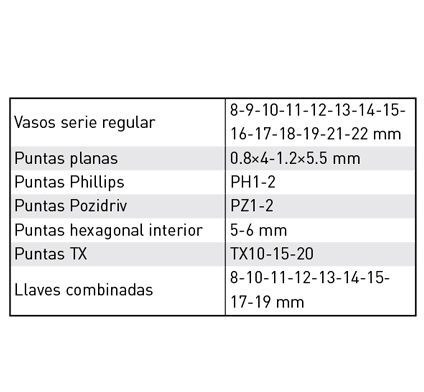 Juego de Llaves de vaso 3/8" de 39 piezas. Contiene 14 vasos hexagonales métrico Carraca de fibra reforzada 3/8" Alargadera 6" Articulación Universal Adaptador de 1/2" F-3/8" 9 Llaves estrella combinada 11 Puntas variadas