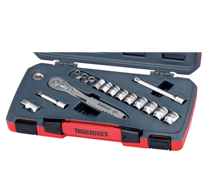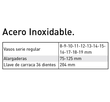 Juego de llavas de vaso 3/8" de 16 piezas. Fabricado en Acero Inoxidable. Compuesto por 12 vasos regulares métrico hexagonales Llave de carraca Alargadera de 75 y 150 mm Adaptador T de 3/8" x 1/2"