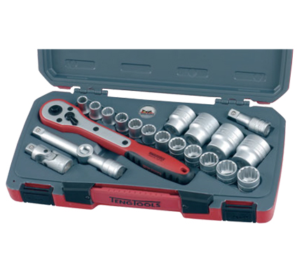 Juego de llavas de vaso 1/2" de 21 piezas. Compuesto por 16 vasos regulares, métrico, Hexagonales. Alargadera de 2 1/2" y 6" Articulación Universal Adaptador de 1/2"F - 3/8" M Carraca de fibra reforzada