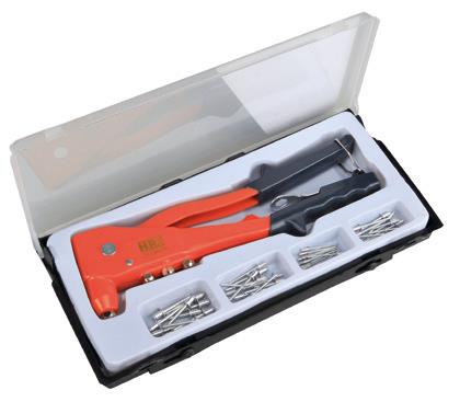 CUERPO EN ALUMINIO CON PALANCA MÓVIL FORJADA Y BOCAS FABRICADAS EN ACERO Y LLAVE PARA CAMBIO DE BOCA TRAE 40 REMACHES: 10 DE 2.4 MM 10 DE 3.2 MM 10 DE 4 MM 10 DE 4.8 MM