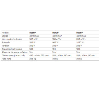 Función automática (Humidistat) o manual. La bomba de desagüe puede funcionar hasta 5 metros de altura. Compresor rotativo.