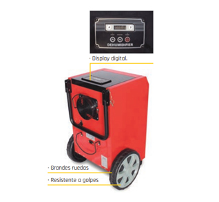 Deshumificadores industriales con bomba de desagüe. Ruedas fabricadas en PE resistente a los golpes y estructura metálica.