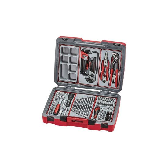Contiene vasos 3/8" 8-22 mm, llaves combinadas 8-19 mm, juego de alicates con tenaza, alicate universal, alicate de corte y alicate de boca redonda, juego de llaves HEX y TX, juego de destornilladores para puntas.